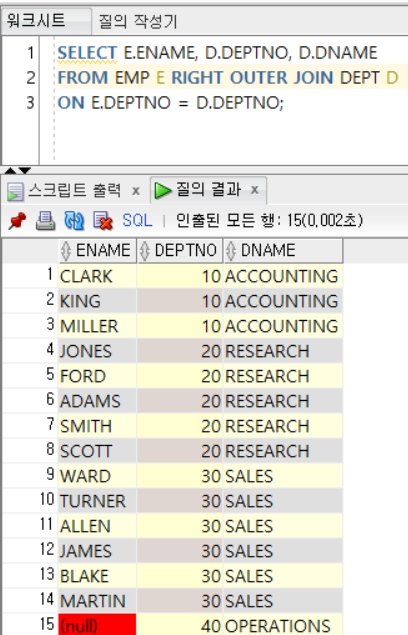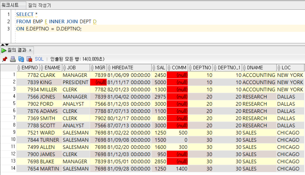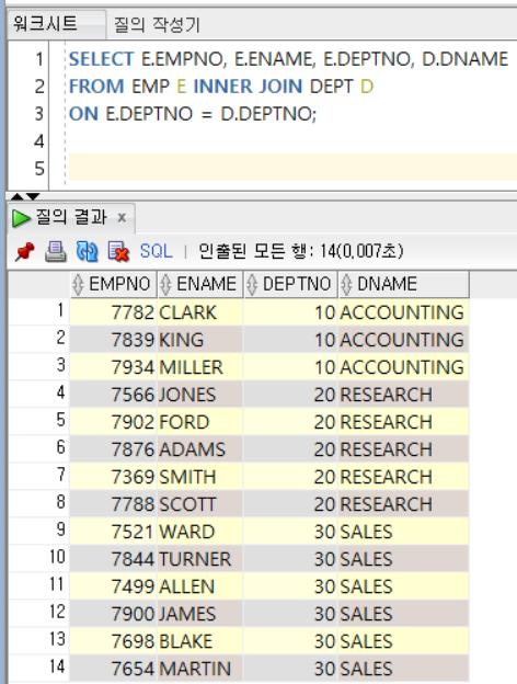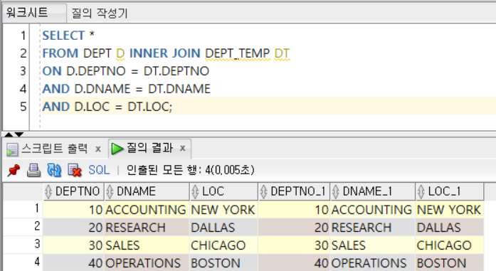 - INNER JOIN은 두 테이블 간의 같은 컬럼에 대해 모두 나오지만(DEPTNO, DEPTNO_1)