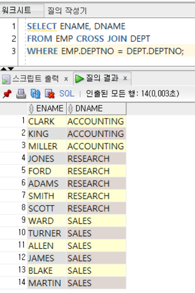 - NATURAL JOIN에서는 E.EMPNO에서 E.처럼 ALIAS나 테이블명과 같은 접두사 사용 X