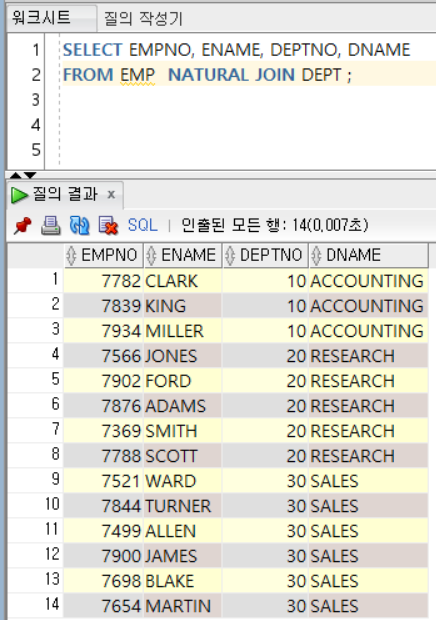 NATURAL JOIN은 두 테이블 간의 같은 컬럼에 대해 통합해서 하나의 컬럼으로 나온다(DEPTNO)