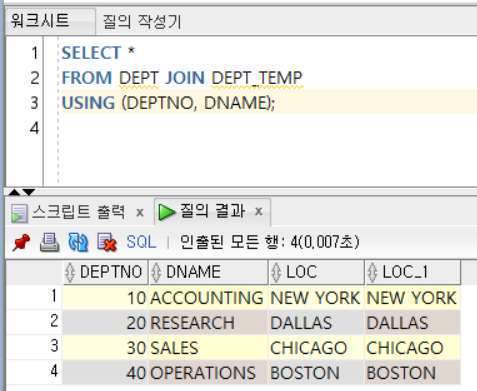 - USING 조건절에 사용되지 않은 컬럼들은 공통된 컬럼이 있을 시 INNER JOIN과 같이 각 테이블별로 2번씩 출력