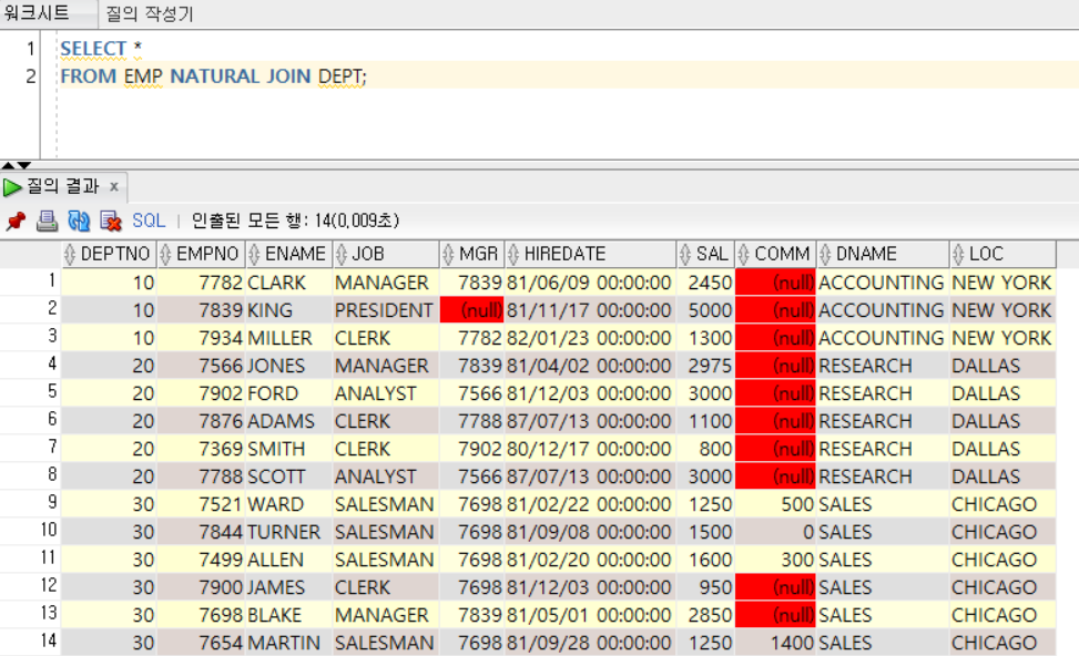 NATURAL JOIN은 두 테이블 간의 같은 컬럼에 대해 통합해서 하나의 컬럼으로 나온다(DEPTNO)