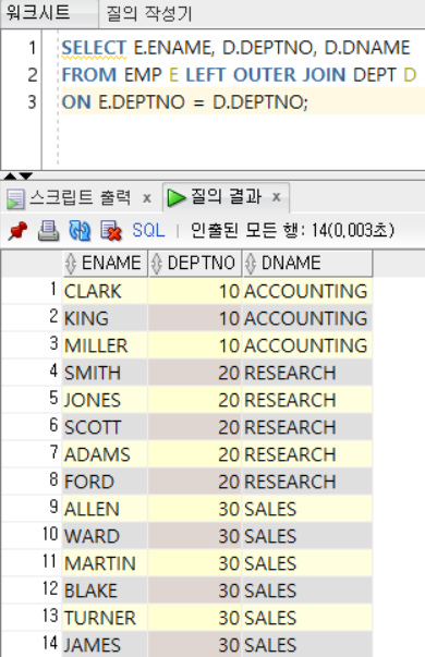 - INNER JOIN은 두 테이블 간의 같은 컬럼에 대해 모두 나오지만(DEPTNO, DEPTNO_1)