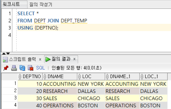 - SELECT 절에 * 사용 시 USING 조건절에 사용된 컬럼이 제일 먼저 출력