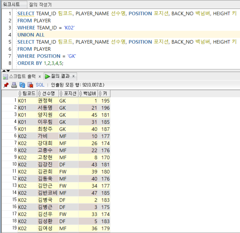 UNION ALL | - 합집합 + 중복된 행도 그대로 표시 - 단순히 결과만 합쳐놓은 것 - 여러 질의 결과가 베타적일 때 사용 - 개별 SQL문의 결과가 중복되지 않을 경우, UNION과 결과가 동일 (정렬 순서에는 차이가 있을 수도 있음) |
