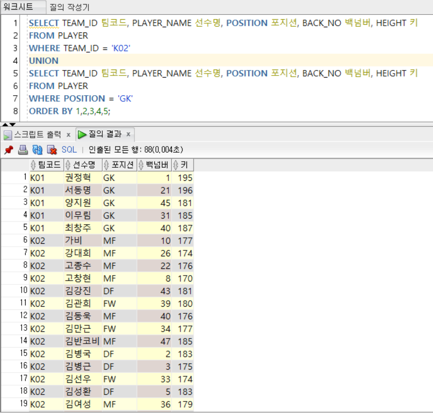 | UNION | - 합집합 - 중복된 행을 하나의 행으로 만듦 |