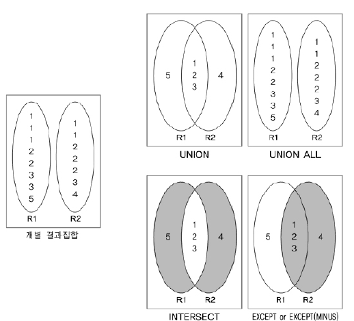 | MINUS/EXCEPT | - 차집합 - 중복된 행을 하나의 행으로 만듦 |