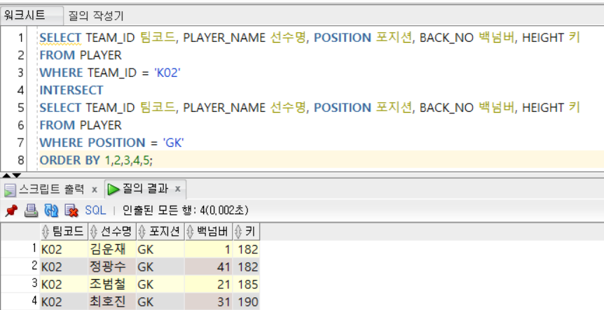 - SELECT ~ INTERSECT SELECT ~ / 두 SELECT절 간에 공통 집합(교집합)