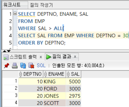 | 비교 연산자 ALL (서브쿼리) | - 서브쿼리 결과에 존재하는 모든 값을 만족하는 조건 |