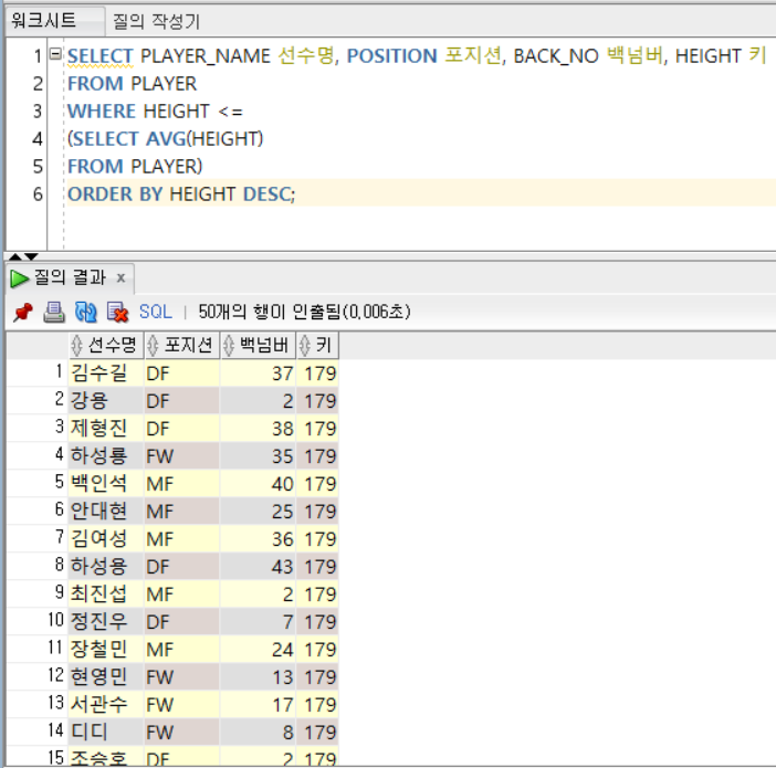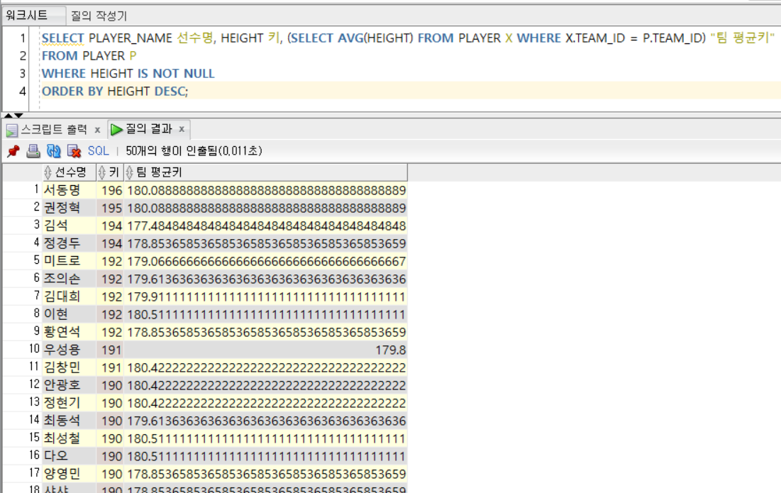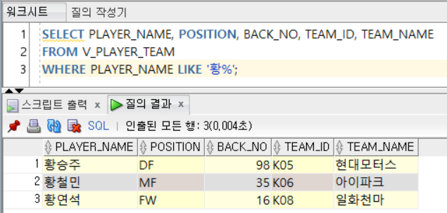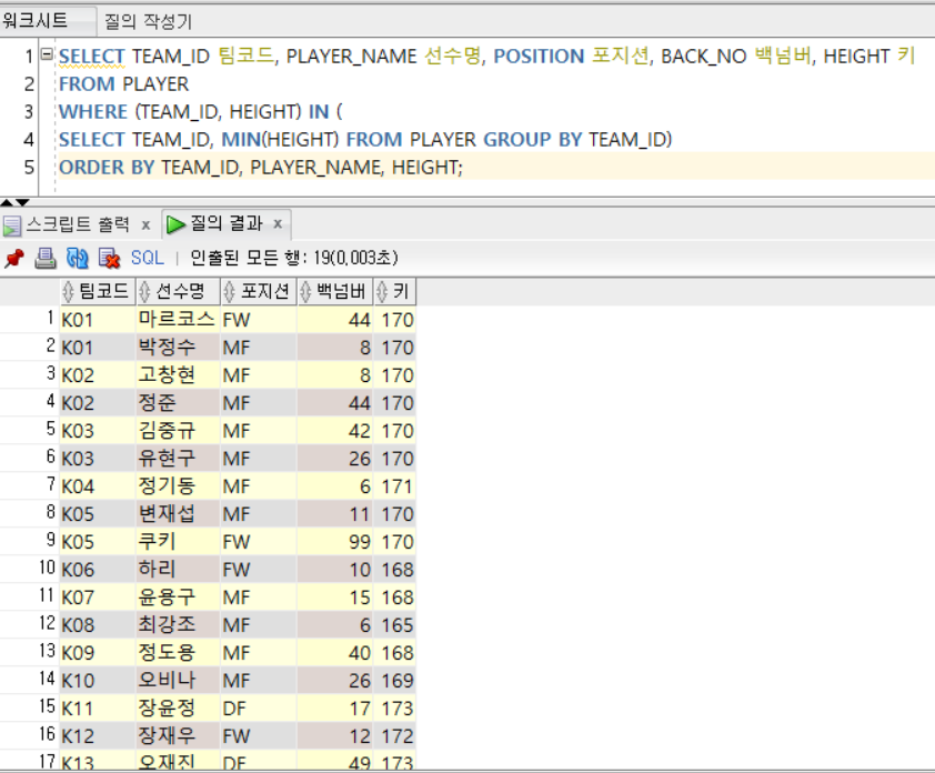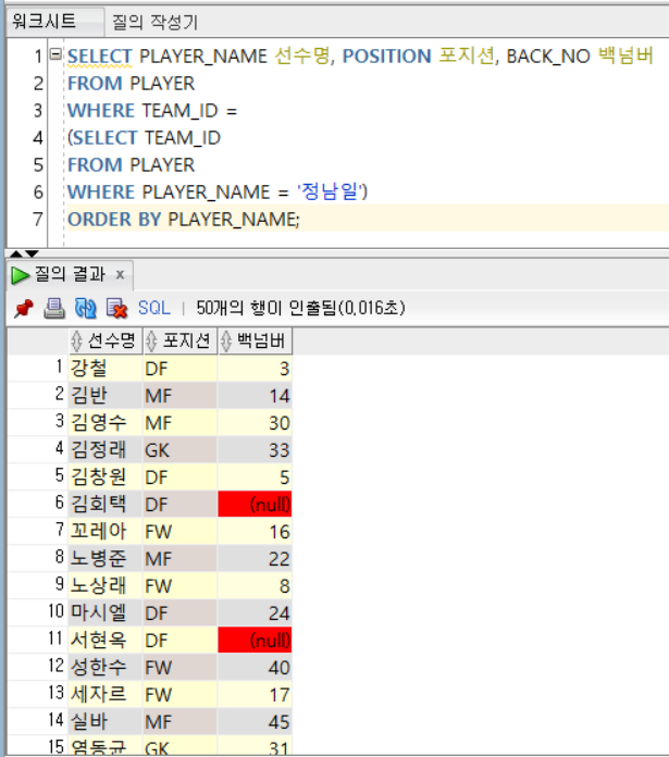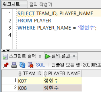 - '정현수'라는 이름을 가진 선수가 2명 존재하기 때문에 다중 행 비교 연산자 IN 사용