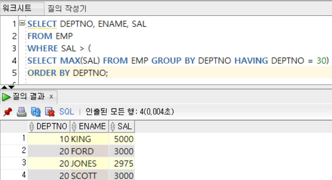 - 단일 행 비교 연산자(=, <, <=, >, >=, <>)와 함께 사용