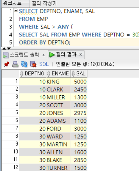 | 비교 연산자 ANY/SOME (서브쿼리) | - 서브쿼리 결과에 존재하는 어느 하나의 값이라도 만족하는 조건 |