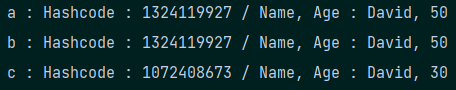return "Hashcode : " + p.hashCode() + " / Name, Age : " + p.getName() + ", " + p.getAge();