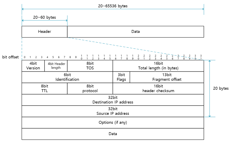 - 고정 헤더 : Version / Header Length / TOS(Type of Service) / Total Length / Identification / Flags / Fragment offset / TTL(Time to live) / Protocol / Header Checksum / Dest IP Addr / Source IP Addr