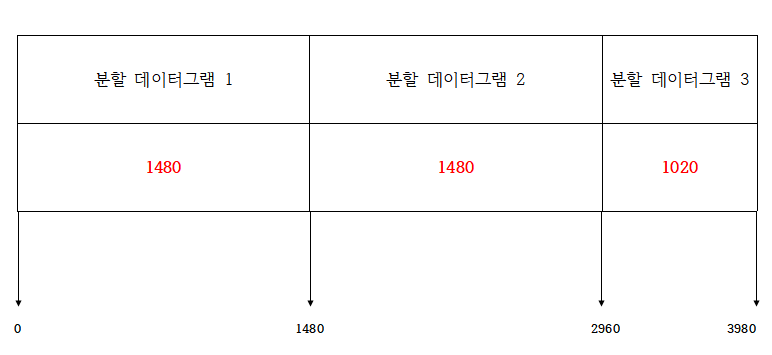 - 분할 데이터그램3의 데이터 길이 = 원본 데이터그램의 데이터 길이 - (분할 데이터그램 1, 2의 데이터 길이)