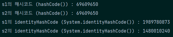 System.out.println("s2의 해시코드 (hashCode()) : " + s2.hashCode());