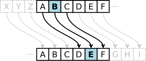 - 알파벳별로 일정한 거리만큼 밀어서 다른 알파벳으로 치환하는 방식
