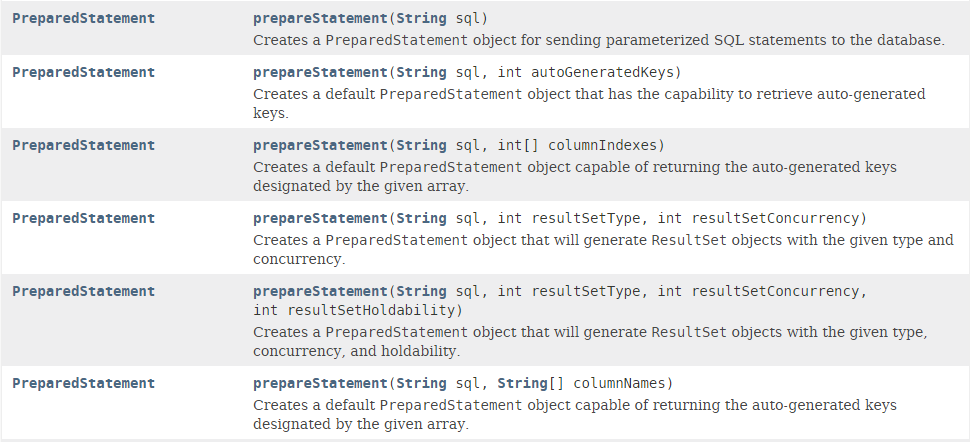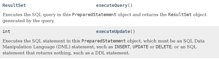 - PreparedStatement의 경우 미리 컴파일 한 후, "?"의 값만 변경해서 재사용하기 때문에 execute~()에 인자가 존재하지 않는다