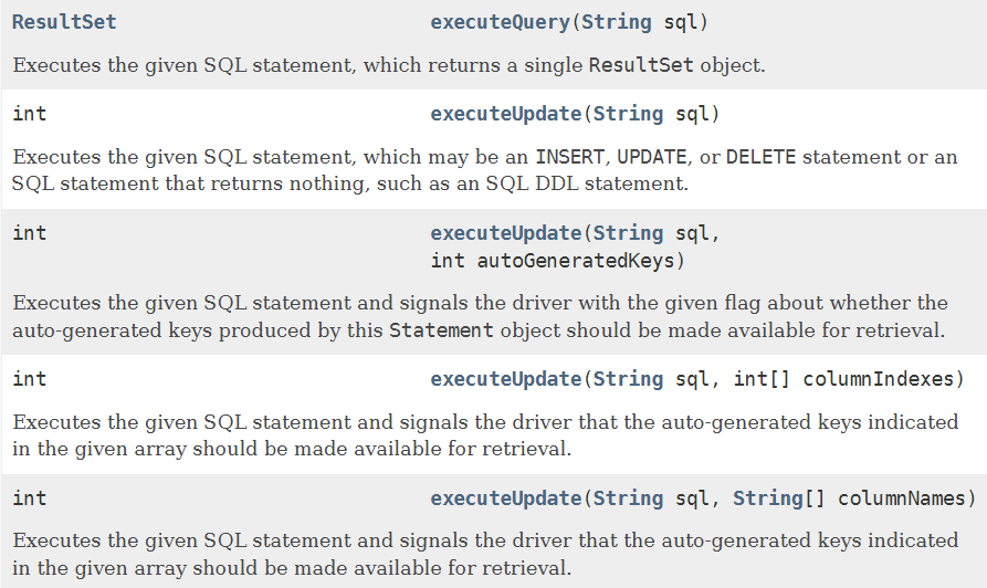 - INSERT/UPDATE/DELETE의 경우 executeUpdate(String sql)를 통해서 요청해야 한다