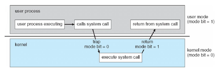 - 이 중 대표적으로 System Call이 있는데 System Call은 User가 OS의 특정 서비스를 받으려고 요청하는 것이기 때문에 사용자 모드에서 발생된다