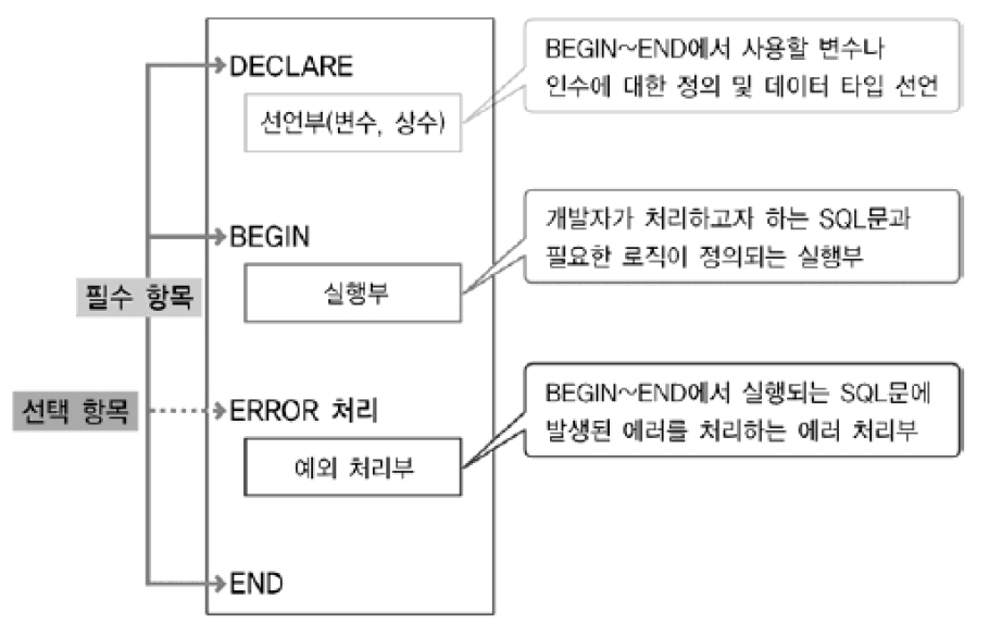 - BEGIN ~ END 절에서 사용될 변수, 인수에 대한 정의, 데이터 타입을 선언