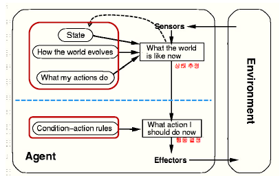 Simple Reflex와는 다르게 그냥 인식된 정보를 그대로 사용하는 것이 아니라 추가적인 지식(Model)을 조합해서 최종적으로 현재 상태를 추정한다