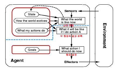 Reflex "X" >> "센서"에 의해서 즉각적인 행동 결정이 아니라 "센서"로 인식한 환경 상태에 대해서 내가 수행할 수 있는 행동들에 대한 결과를 예측하고 그 결과 중에서 Goal에 더 가까운 행동을 결정한다