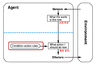 - "Condition-Action Rules"는 현재 환경의 상태가 내부적으로 정의된 조건에 들어맞는다면 해당 조건에 대한 행동을 수행한다