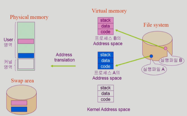 어떤 프로그램을 메인 메모리로 올릴때는 disk에서 바로 메인 메모리로 올리지 않고 중간에 "Virtual Memory"를 거쳐서 올라간다