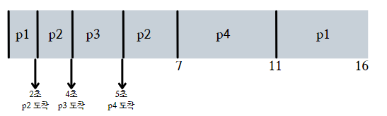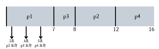 만약 p1 - p2 - p3순으로 도착했다면 (거의 동시에 0초에 도착했고 순서가 p1 - p2 - p3)