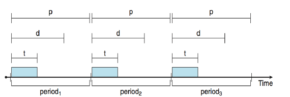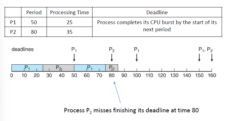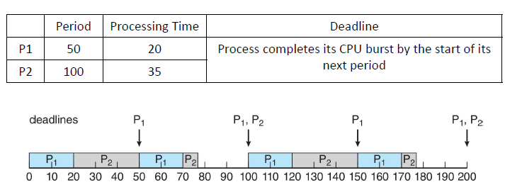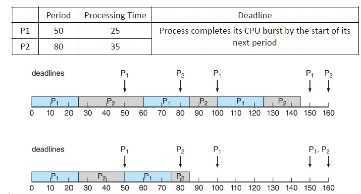 - 각 프로세스들은 일정한 간격으로 CPU가 필요하고, 각각의 주기 프로세스들은 CPU를 할당 받았을 때 고정된 time quantum, deadline, 주기 p가 정해져 있다