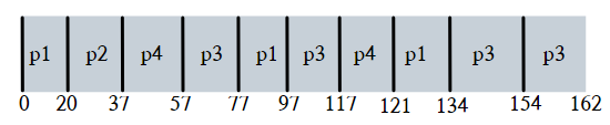 그리고 이후에 p1이 시작되는데 p1은 수행시간이 20이므로 "55"에 끝난다