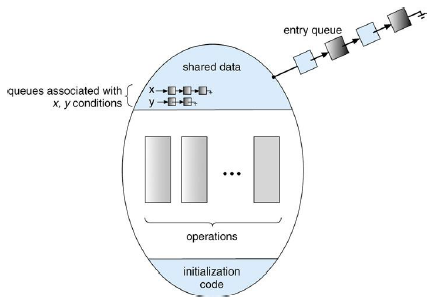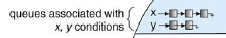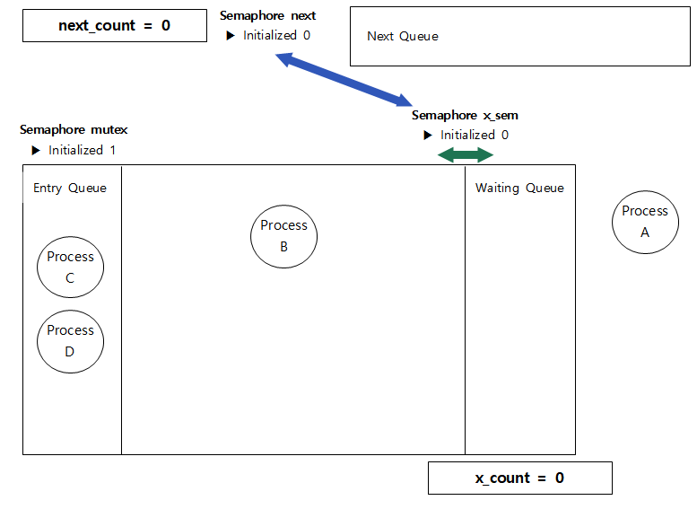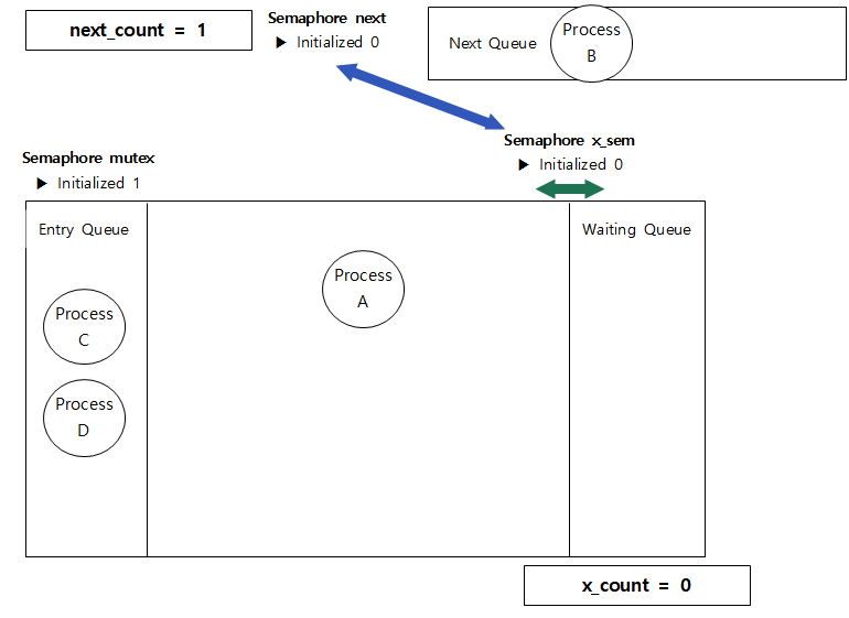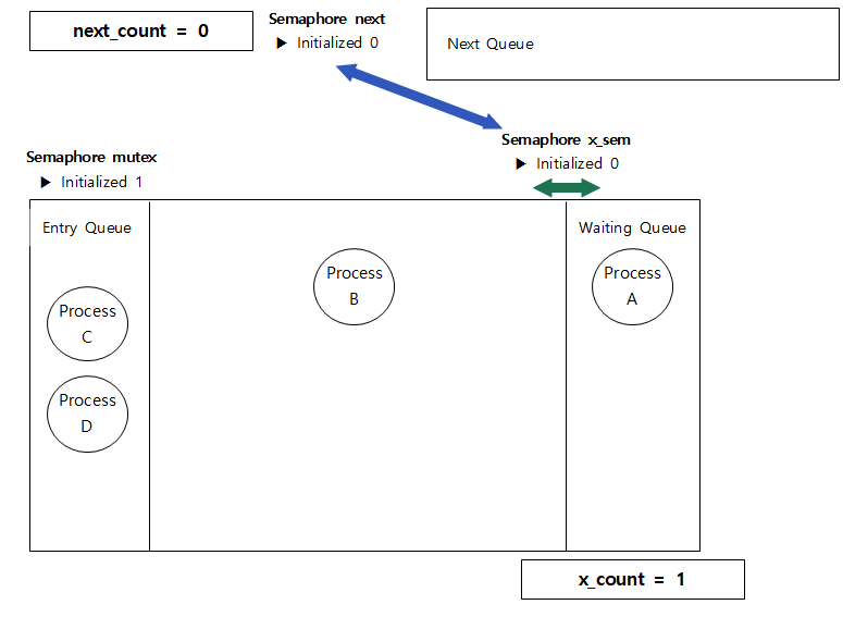 x_count > 0이고 "signal & wait"로 구현이 되었으므로 Semaphore next & wait(next)를 통해서 프로세스 B는 현재 x waiting queue에 존재하는 프로세스 A가 모니터를 떠나거나 다른 조건에 의해서 block이 될때까지 Next Queue에서 잠시 대기한다