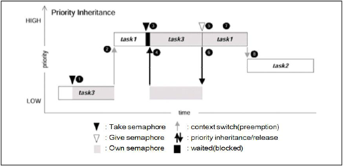 - task3가 Binary Semaphore 자원을 얻고 있는 상태면 task1은 일단 Block이 된다