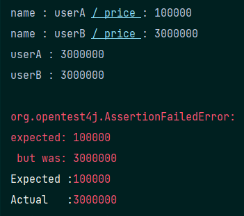 그리고 밑에 Test에서 userA는 10만원짜리 물건을 주문했고, userB는 300만원짜리 물건을 주문했다