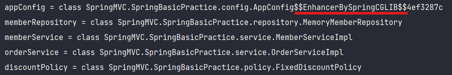 위의 결과를 보게되면 스프링 설정 클래스의 getClass()를 조회한 결과로 "EnhancerBySpringCGLIB"라는 것이 붙게 되었다