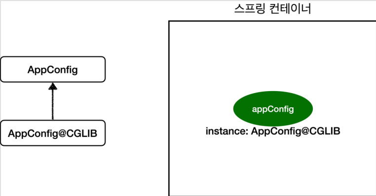 여기서 CGLIB라는 바이트코드 조작 라이브러리를 사용해서 AppConfig 클래스를 상속받은 Proxy를 만들고, Proxy를 스프링 빈으로 등록한다