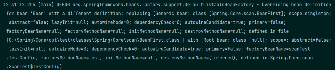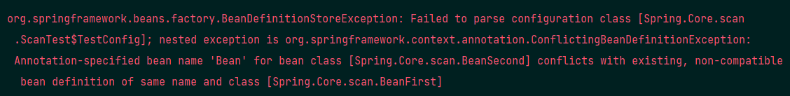 현재 BeanFirst, BeanSecond 클래스 둘 다 @Component에 의해서 자동 스캔 대상이고, 둘다 빈 이름을 "Bean"으로 등록되게 설정을 하였다