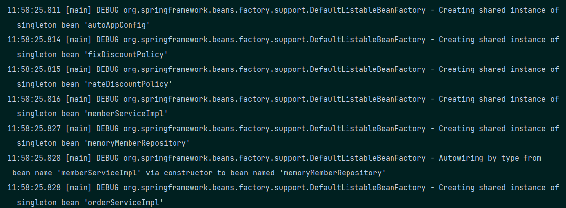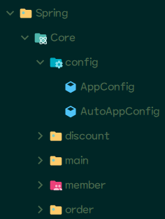 이렇게 지정하게 된다면 "Spring.Core" 하위에 존재하는 패키지{discount, member, order}를 뒤질 수 있기 때문에 위에서 @Component로 지정한 클래스들에 대한 스프링 빈이 등록이 된다