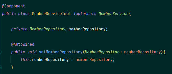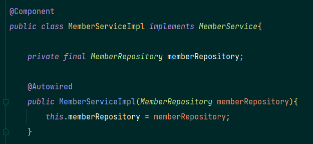 그리고 대부분 주입 대상을 필드 상에서 final로 지정하는데 final로 지정하면 초기화를 해주든 생성자에 넣어주든 해줘야 하기 때문에 필수적 의존관계상에서 많이 사용한다