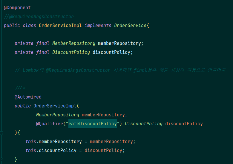 - @Qualifier의 구분자를 통해서 스프링 빈 매칭 시도 (rateDiscountPolicy)