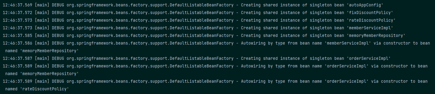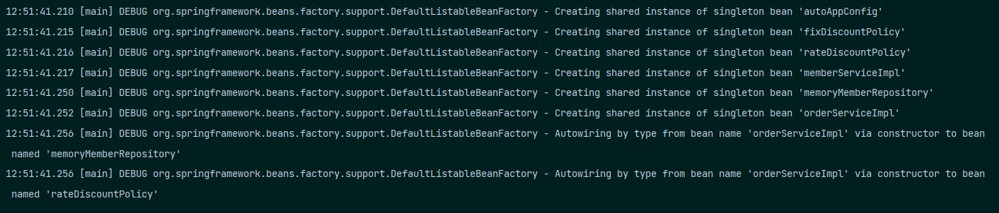 생성자 주입의 로그를 보면 memberServiceImpl에 대한 Autowiring 로그가 없는 것을 확인할 수 있다