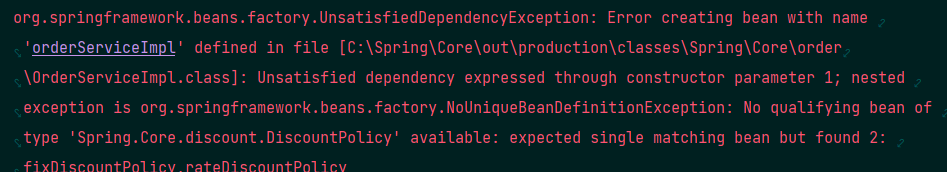- 결국 "private final DiscountPolicy discountPolic"에서 DiscountPolicy를 구현한 2개의 정책 중 어느 것을 선택할지 몰라서 발생하는 오류