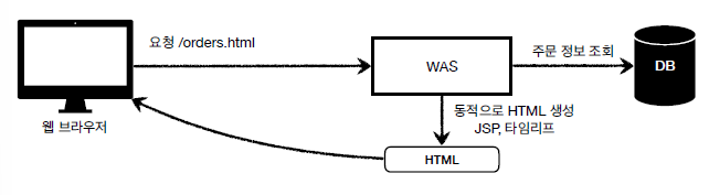 WAS는 logic의 수행이 가능하기 때문에 client의 request에 대해서 "logic을 수행"하고 그에 따라서 변경된 "동적인 HTML"을 제공할 수 있다