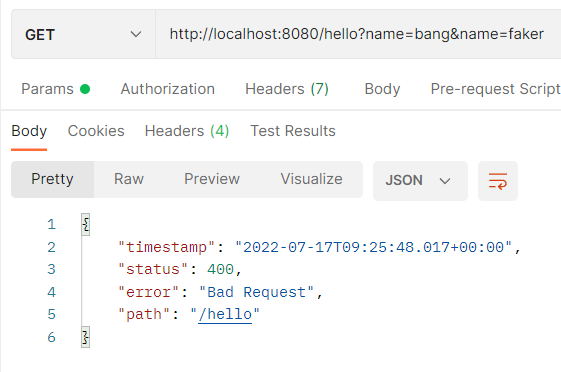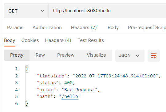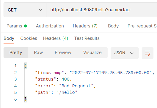 "/hello"경로에 이어서 쿼리 파라미터가 "name=faker"가 없는 경우 400 에러가 발생한다