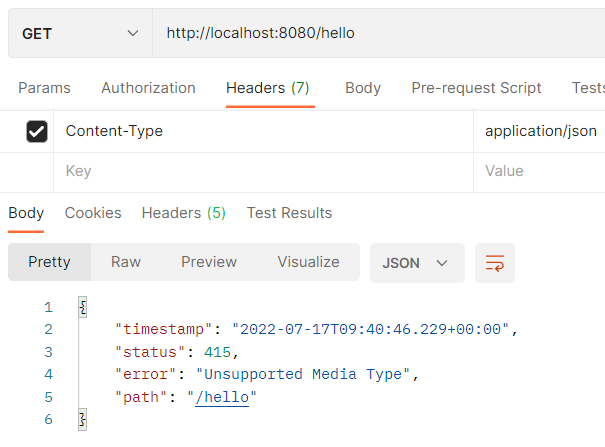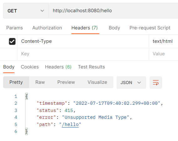 >> consumes에서 지정한 Content-Type가 맞지 않는 요청이 들어온다면 "415 에러"가 발생하게 된다