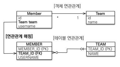 위의 다대일 단방향 연관관계에서는 객체입장에서 Member → Team으로 가는 방향은 존재하지만 Team → Member로 가는 방향은 존재하지 않는다