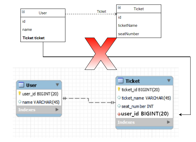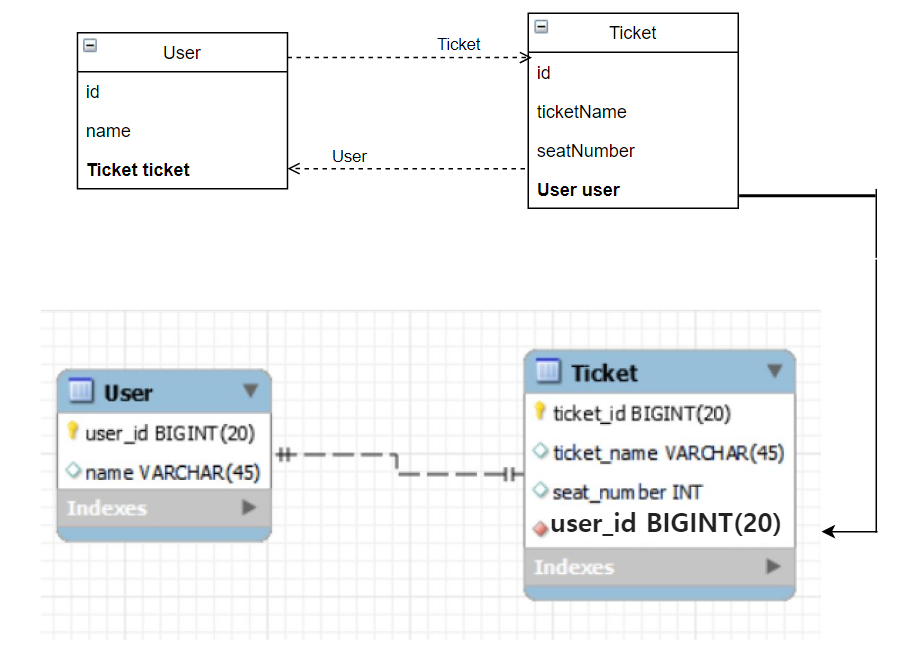 일반적으로 생각해보면 "User는 Ticket 하나를 소유할 수 있다"이므로 User를 "주테이블"로 생각해서 매핑해보자