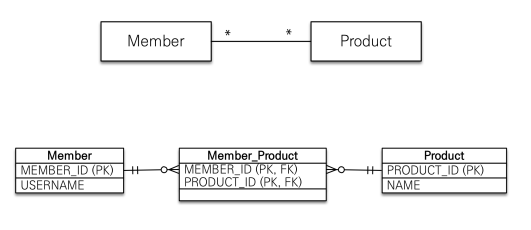 Member & Product는 다대다 관계이므로 "Member_Product"라는 연결 테이블을 통해서 {일대다 - 다대일}로 풀어버렸다