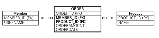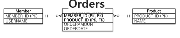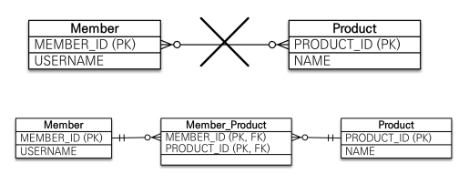 Member & Product는 다대다 관계이므로 "Member_Product"라는 연결 테이블을 통해서 {일대다 - 다대일}로 풀어버렸다