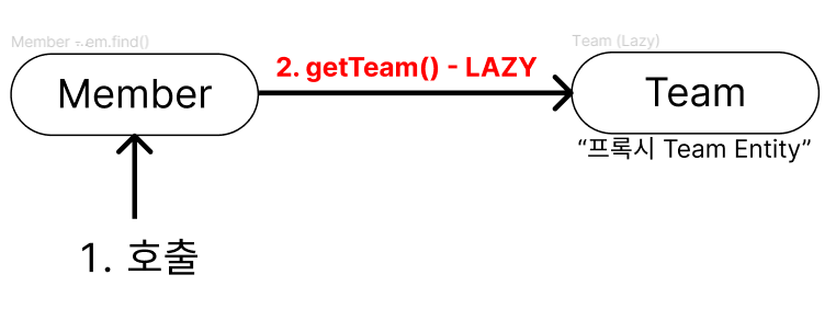 Team findTeam = em.find(Team.class, 1L); // findMember의 팀을 미리 조회해서 실제 Team Entity를 영속성 컨텍스트에 보관